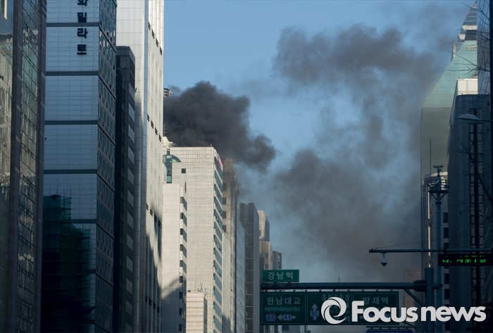 (서울=포커스뉴스) 8일 오후 서울 역삼역 인근 한 건물 공사장에서 화재가 발생, 검은 연기가 치솟고 있다.