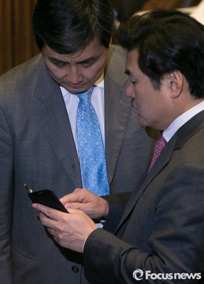 (서울=포커스뉴스) 8일 오후 서울 여의도 국회에서 열린 338회 국회(임시회) 3차 본회의에 참석한 원유철(오른쪽) 새누리당 원내대표와 이종걸 더불어민주당 원내대표가 대화하고 있다.