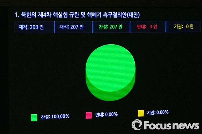 (서울=포커스뉴스) 19대 국회 12월 임시국회 마지막날인 8일 오후 서울 여의도 국회 본회의장에서 북한의 제4차 핵실험 규탄 및 핵폐기 촉구 결의안이 통과되고 있다.