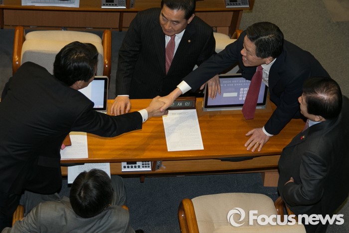 (서울=포커스뉴스) 8일 오후 서울 여의도 국회에서 열린 338회 국회(임시회) 3차 본회의에 참석한 주승용 더불어민주당 의원이 정청래 최고위원 등과 인사하고 있다.