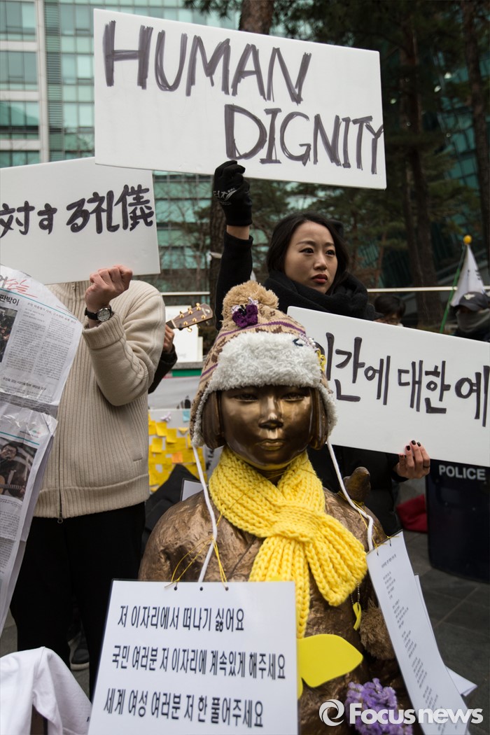 한편 반 총장은 지난해 12월 28일(현지시각) 성명을 통해 "한일 양국이 역사를 인식하면서 미래를 바라보게 됐다"며 "한일 관계를 개선하려는 박근혜 대통령과 아베 신조 일본 총리의 리더십을 높이 평가한다"며 환영의 뜻을 밝힌 바 있다.(서울=포커스뉴스) 6일 오후 서울 종로구 위안부 소녀상 앞에서 올해로 24주년을 맞은 일본군 위안부 문제 해결을 위한 1212차 수요 시위가 끝난 후 예술인 참석자들이 피켓을 들고 퍼포먼스를 하고 있다. 2016.01.06 김흥구 기자