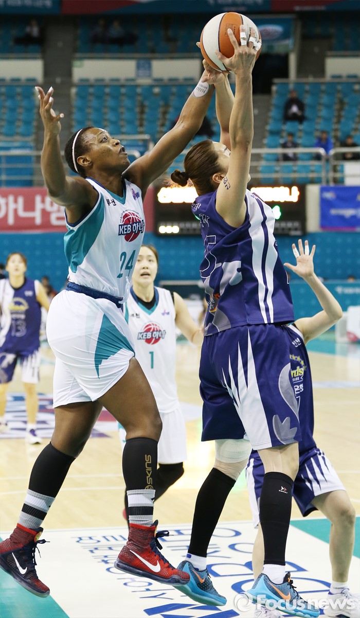 (부천=포커스뉴스) 8일 부천체육관에서 열린 2015-2016 여자프로농구 KEB하나은행-신한은행 경기에서 신한은행 신정자와 KEB하나은행 샤데 휴스턴이 리바운드볼을 다투고 있다.