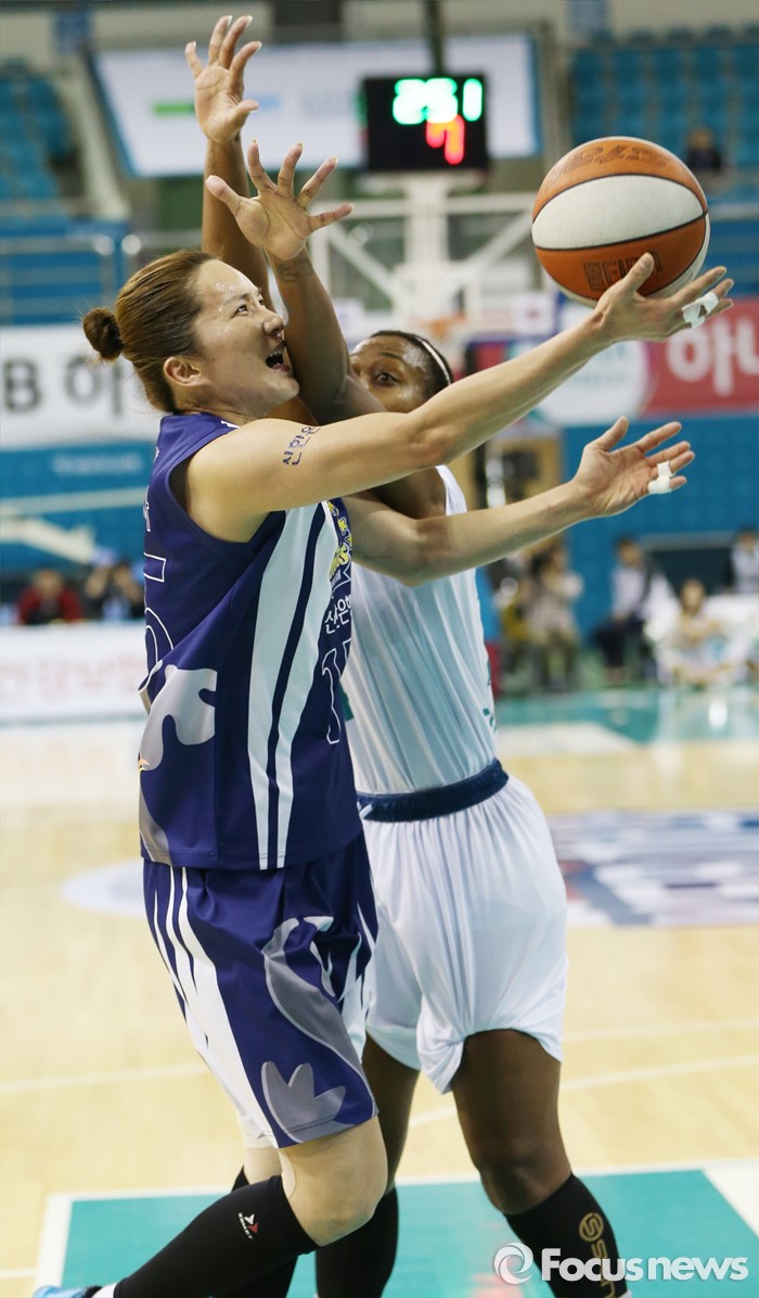 (부천=포커스뉴스) 8일 부천체육관에서 열린 2015-2016 여자프로농구 KEB하나은행-신한은행 경기에서 신한은행 신정자가 KEB하나은행 샤데 휴스턴의 마크를 뚫으며 레이업슛을 시도하고 있다.