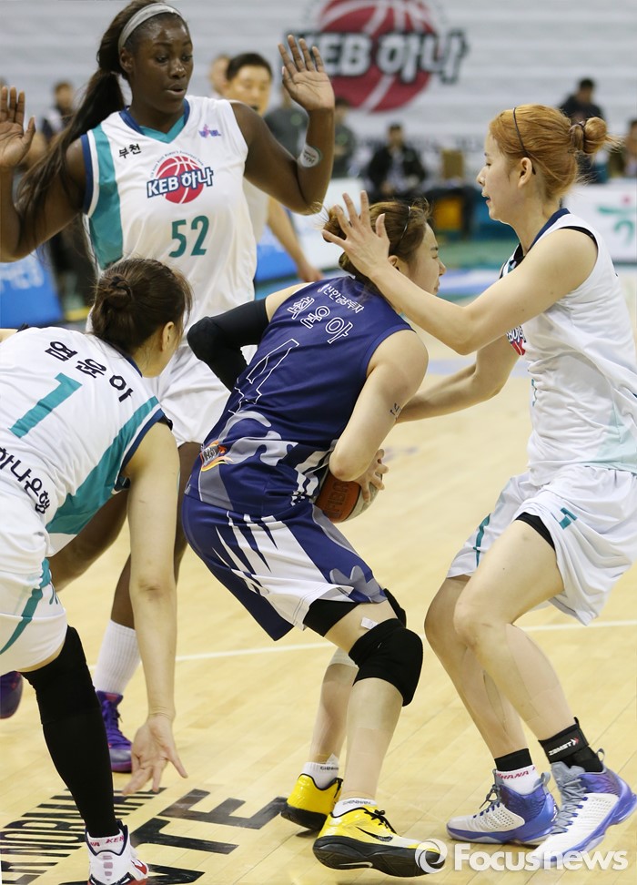 (부천=포커스뉴스) 8일 부천체육관에서 열린 2015-2016 여자프로농구 KEB하나은행-신한은행 경기에서 신한은행 최윤아를 KEB하나은행 첼시 리, 염윤아, 김이슬이 에워싸며 수비하고 있다.