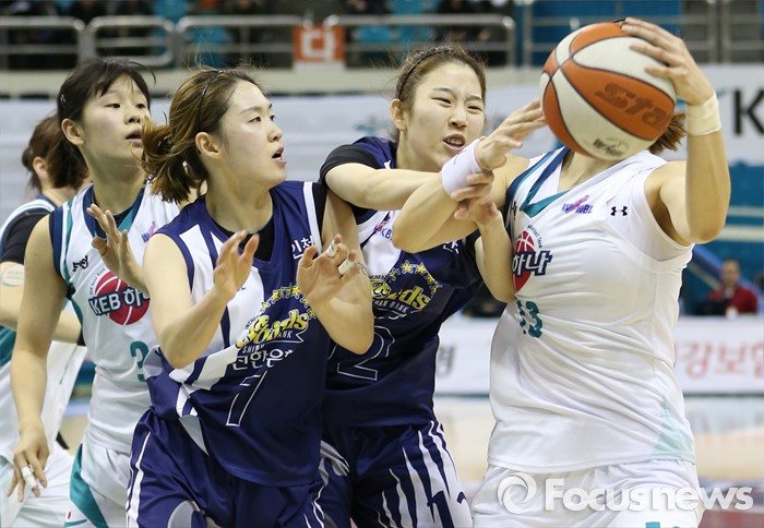 (부천=포커스뉴스) 8일 부천체육관에서 열린 2015-2016 여자프로농구 KEB하나은행-신한은행 경기에서 신한은행 윤미지와 신재영이 KEB하나은행 김정은의 볼을 가로채려 달려들고 있다.