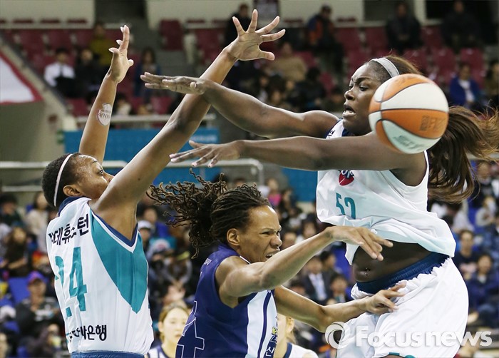 (부천=포커스뉴스) 8일 부천체육관에서 열린 2015-2016 여자프로농구 KEB하나은행-신한은행 경기에서 신한은행 모니크 커리가 KEB하나은행 첼시 리와 샤데 휴스턴의 수비를 뚫으며 패스하고 있다.
