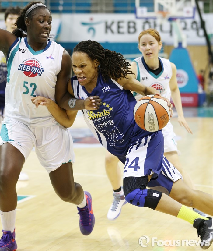 (부천=포커스뉴스) 8일 부천체육관에서 열린 2015-2016 여자프로농구 KEB하나은행-신한은행 경기에서 신한은행 모니크 커리가 KEB하나은행 첼시 리의 수비를 밀치며 돌파하고 있다.