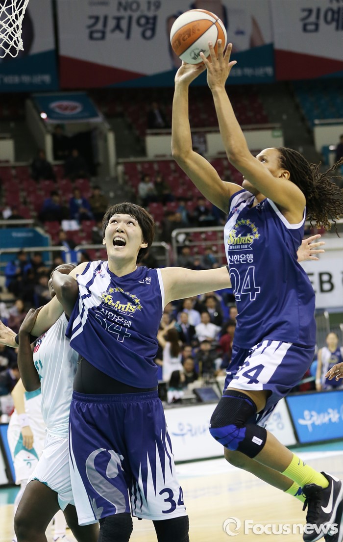 (부천=포커스뉴스) 8일 부천체육관에서 열린 2015-2016 여자프로농구 KEB하나은행-신한은행 경기에서 신한은행 모니크 커리가 골밑에서 점프슛을 쏘고 있다.