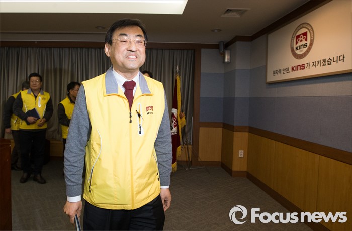(대전=포커스뉴스) 8일 저녁 대전 유성구 한국원자력안전기술원 중회의실에서 김무환 한국원자력안전기술원장이 북한 핵실험 이후 반사성핵종 탐지·분석 결과 브리핑을 마치고 회의장을 나서고 있다.