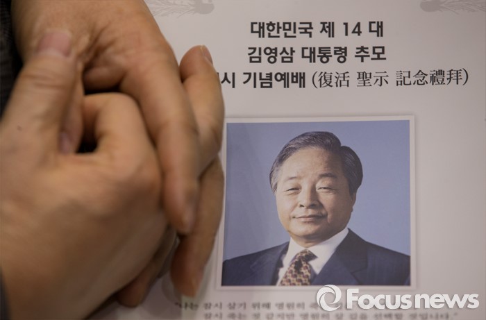 (서울=포커스뉴스) 9일 오후 서울 동작구 국립현충원에서 열린 '김영삼 대통령 추모 부활 성시 기념예배'에서 한 참석자가 기도하고 있다.