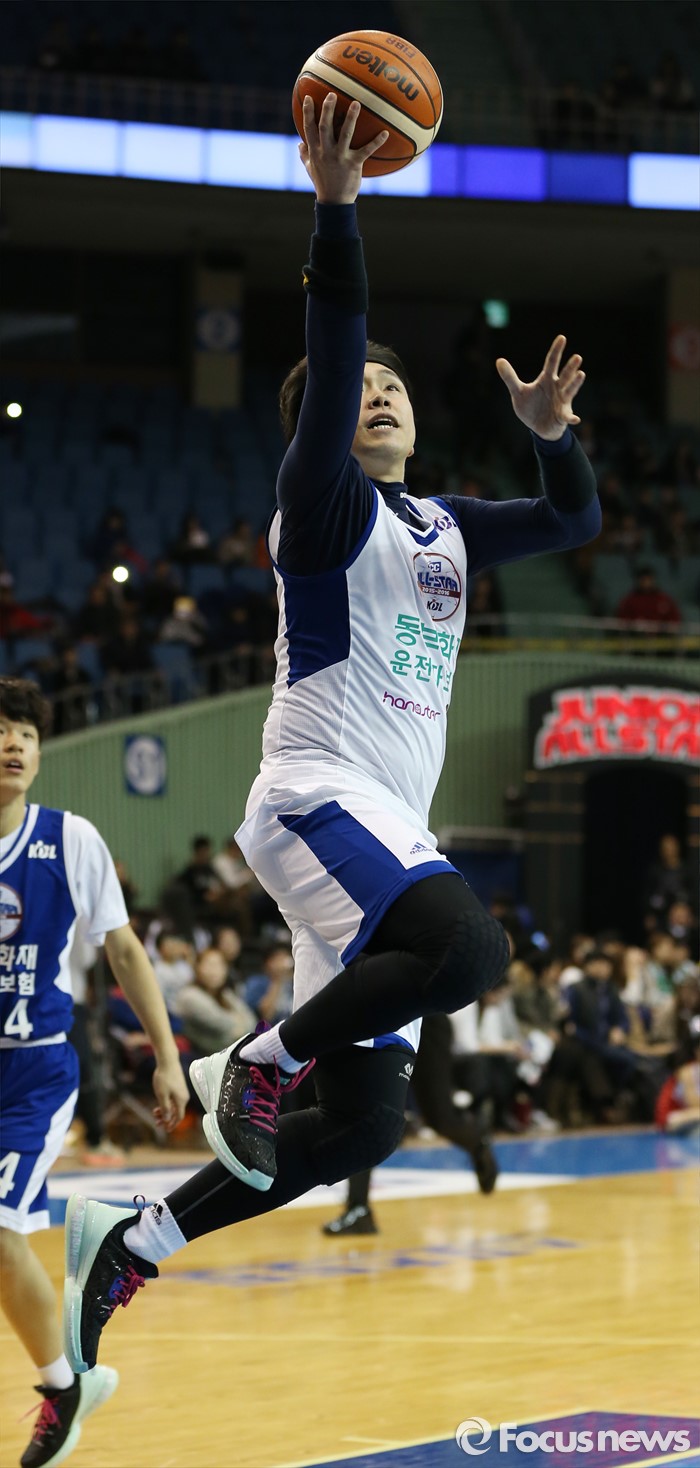 (서울=포커스뉴스) 10일 서울 잠실실내체육관에서 열린 2015-2016 프로농구 올스타전 오프닝행사인 연예인농구팀-유소년 올스타 경기에서 연예인팀 모세가 레이업슛을 시도하고 있다.