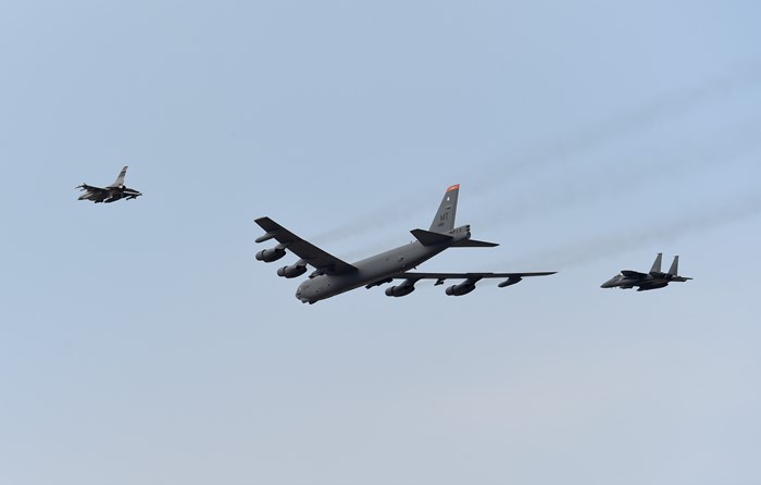 (서울=포커스뉴스) 북한의 수소폭탄 실험 이후 미국의 핵우산 제공 방침에 따라 미 공군의 전략 폭격기가 한반도로 전개한 10일 경기도 평택시 주한미군 오산공군기지 상공에 B-52 폭격기와 우리 공군의 F-15K와 미군 F-16 전투기의 호위를 받으며 비행하고 있다. <사진제공=국방일보>