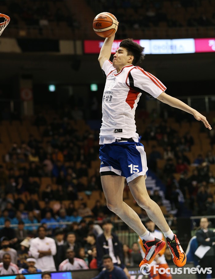 (서울=포커스뉴스) 10일 서울 잠실실내체육관에서 열린 2015-2016 프로농구 올스타전 덩크슛 콘테스트 예선에서 김종규가 원핸드 덩크슛을 시도하고 있다.