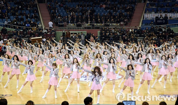(서울=포커스뉴스) 10일 서울 잠실실내체육관에서 열린 2015-2016 프로농구 올스타전에서 101명의 걸그룹 연습생들이 합동공연을 펼쳐 코트의 열기를 달구고 있다.