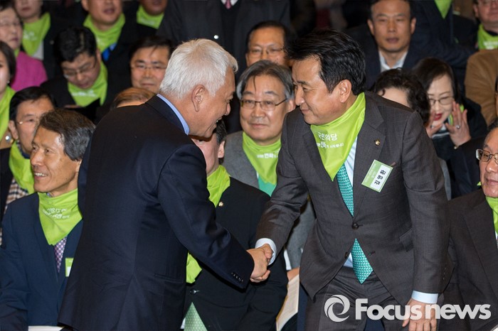 (서울=포커스뉴스) 김한길(왼쪽) 국민의당 의원이 10일 오후 서울 종로구 세종문화회관 세종홀에서 열린 '국민의당 창당발기인대회'에 자리해 김영환 의원과 악수하고 있다.