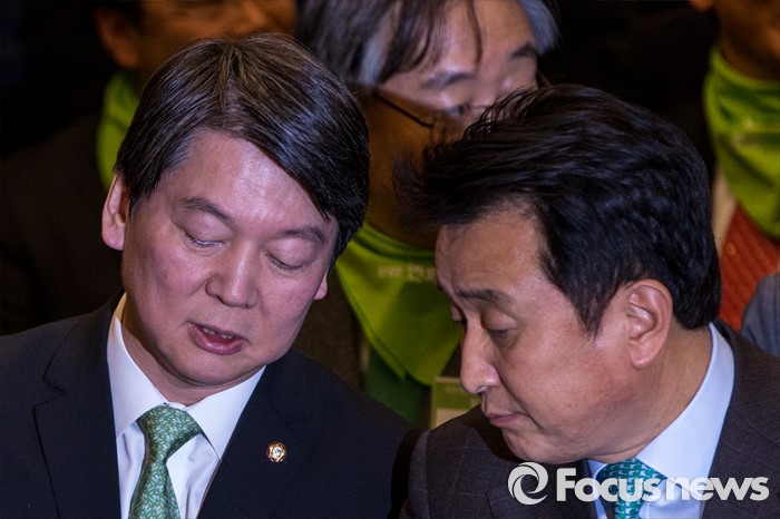 (서울=포커스뉴스) 안철수(왼쪽) 국민의당 의원과 김영환 의원이 10일 오후 서울 종로구 세종문화회관 세종홀에서 열린 '국민의당 창당발기인대회'에 자리해 대화를 나누고 있다.