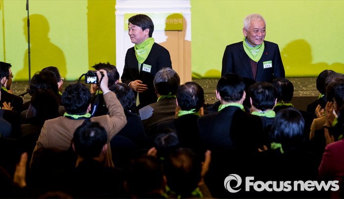 (서울=포커스뉴스) 안철수(왼쪽) 국민의당 의원과 김한길 국민의당 의원이 10일 오후 서울 종로구 세종문화회관 세종홀에서 열린 '국민의당 창당발기인대회'에 자리해 발기인들에게 인사 하고 있다.