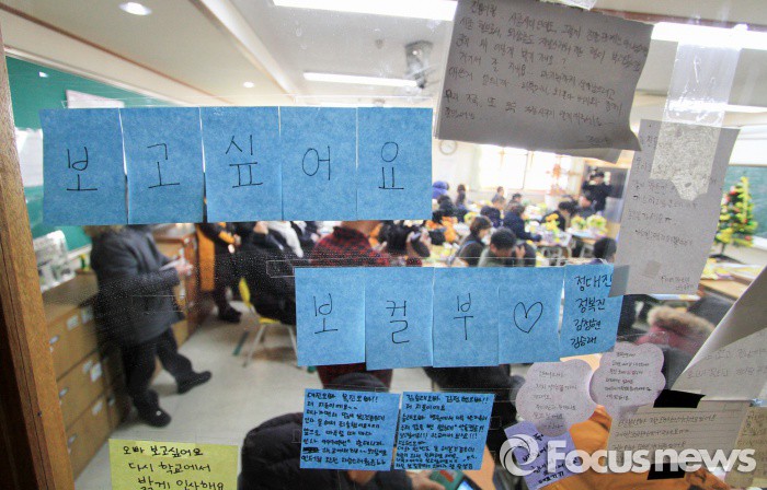 (안산=포커스뉴스) 10일 오후 경기도 안산 단원고 '4.16 기억의 교실'에서 유가족과 시민단체레서마련한세월호 참사 희생학생들을 위한 겨울방학식이 열리고 있다. 안산단원고 세월호 피해자 모임인 4.16 유가족협의회 회원들은12일로 예정된 단원고 졸업식에 불참하는 대신 시민들과 2014년 4월 16일 세월호 참사로 희생된 학생과 교사들이 사용하던 교실과 교무실인 '4.16 기억의 교실'에서 명예 3학년 1반부터 10반 교실까지 자리 앉기, 출석 부르기, 방학식 메시지, 안산분향소 방문 등 순으로 방학식을 진행했다. <사진제공= 이관희사진가>