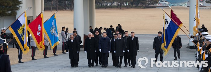 (서울=포커스뉴스) '국민의당' 창당을 추진하는 안철수(오른쪽 두번째부터) 의원, 한상진 국민의당 공동창당준비위원장, 김한길 의원이 11일 오전 서울 동작구 국립서울현충원을 방문해 현충탑으로 향하고 있다.