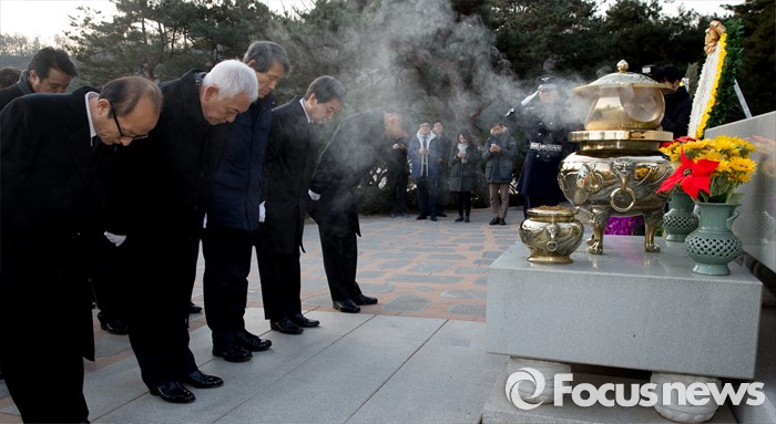 (서울=포커스뉴스) '국민의당' 창당을 추진하는 안철수(오른쪽 두번째부터) 의원, 한상진 국민의당 공동창당준비위원장, 김한길 의원이 11일 오전 서울 동작구 국립서울현충원 故 김대중 전 대통령 묘역을 방문해 참배를 하고 있다.