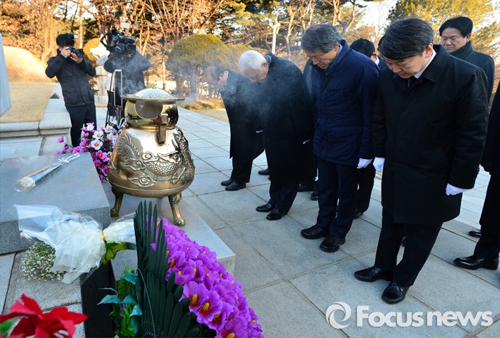 (서울=포커스뉴스) 안철수(오른쪽부터) 의원, 한상진 공동창당준비위원장, 김한길 의원 등이 11일 오전 서울 동작구 국립서울현충원 이승만 대통령 묘역을 찾아 묵념하고 있다.