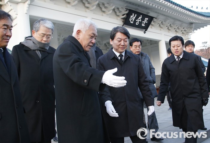 (서울=포커스뉴스) '국민의당' 창당을 준비중인 안철수, 김한길(왼쪽) 의원 등이 11일 오전 동작구 국립서울현충원 현충탑을 참배한 뒤 버스를 타기 위해 이동하고 있다.