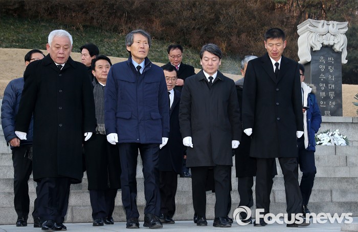 '국민의당' 한상진 공동창당준비위원장과 안철수, 김한길 의원 등이 11일 오전 서울 동작구 국립서울현충원 박정희 전 대통령 묘소를 참배한 뒤 이동하고 있다. 2016.1.11/뉴스1