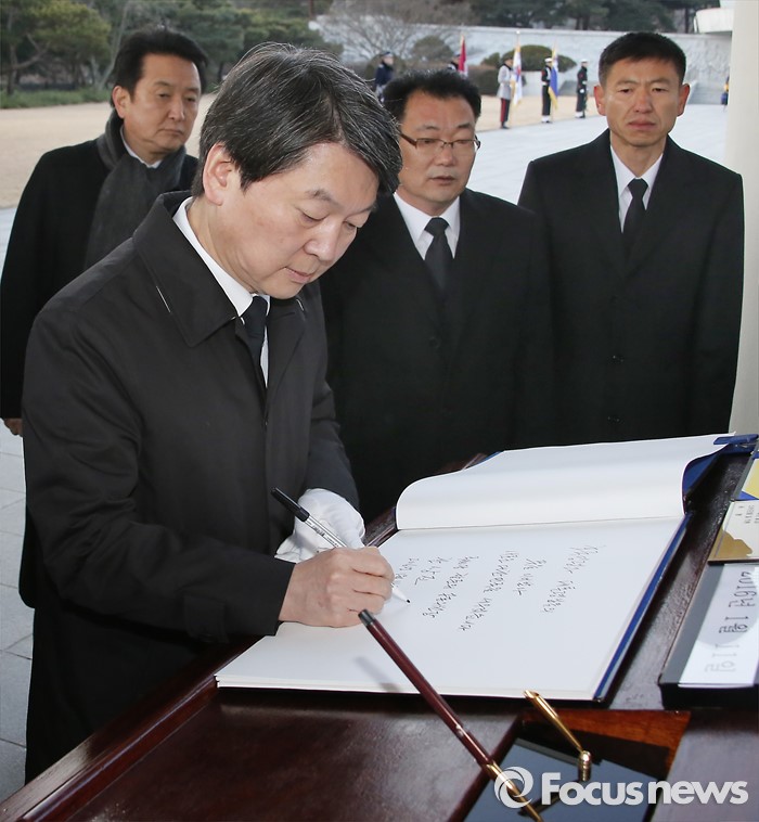 (서울=포커스뉴스) '국민의당' 창당을 준비중인 안철수 의원이 11일 오전 동작구 국립서울현충원 현충탑을 참배한 뒤 방명록을 작성하고 있다.