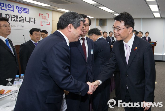 (세종=포커스뉴스) 강호인 국토교통부장관이 11일 오전 세종시 정부세종청사 국토부 대회의실에서 열린 산하단체장 신년인사회에 참석해 참석자와 악수를 하고 있다.