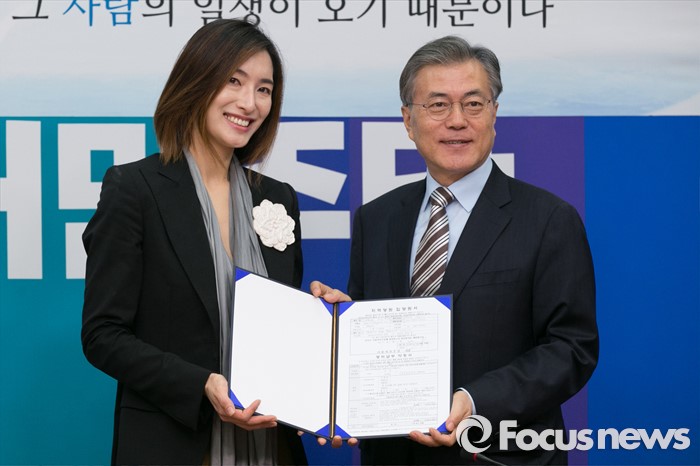 (서울=포커스뉴스) 11일 오후 서울 여의도 국회 더불어민주당 당대표회의실에서 김빈(왼쪽) 디자이너가 입당 기자회견을 마치고, 문재인 대표와 기념사진을 찍고 있다.