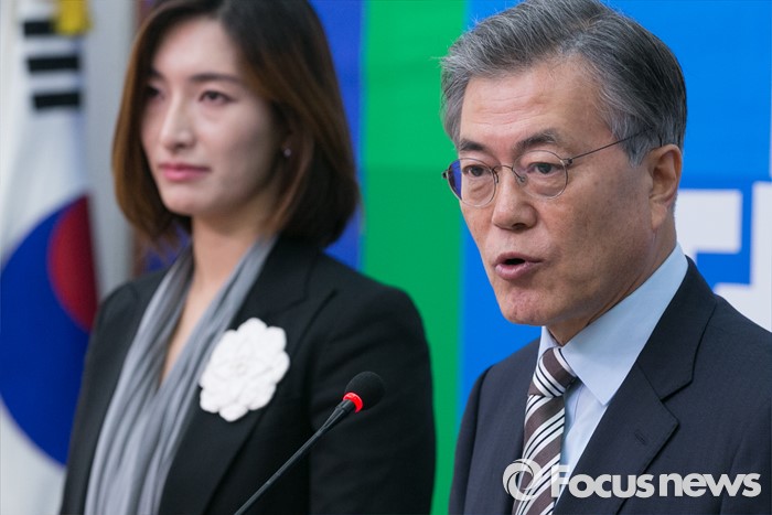 (서울=포커스뉴스) 문재인(오른쪽) 더불어민주당 대표가 11일 오후 서울 여의도 국회 당대표회의실에서 김빈(왼쪽) 디자이너의 입당 기자회견에 참석해 인사말을 하고 있다.