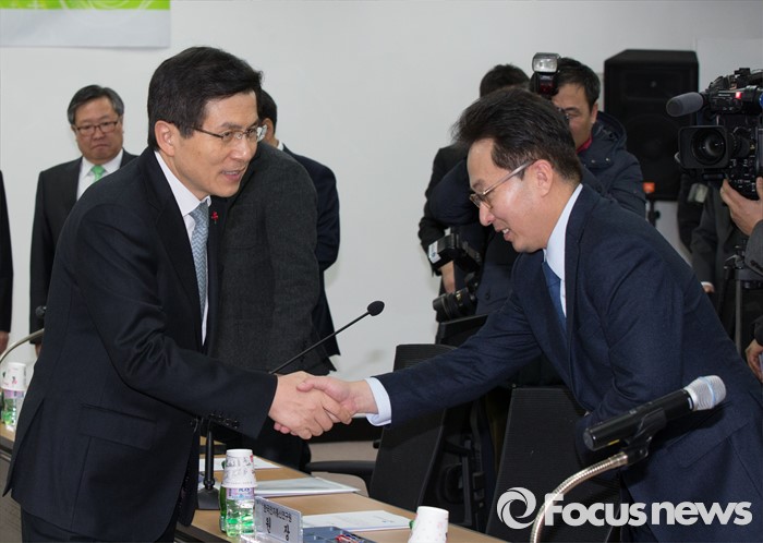 (대전=포커스뉴스) 황교안 국무총리가 11일 대전 유성구 융합기술연구생산센터를 방문, 출연연-중소·중견기업과 간담회를 앞두고 참석자와 악수를 하고 있다.