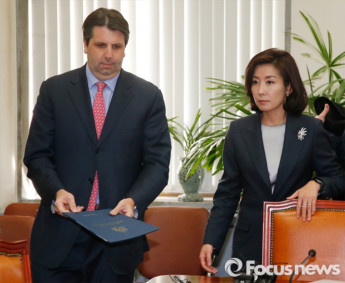 (서울=포커스뉴스) 11일 오후 서울 여의도 국회 외교통일위원회에서 열린 북한 핵실험 관련 간담회에 참석한 나경원(오른쪽) 위원장과 마크 리퍼트 주한미국대사가 자리에 앉고 있다.