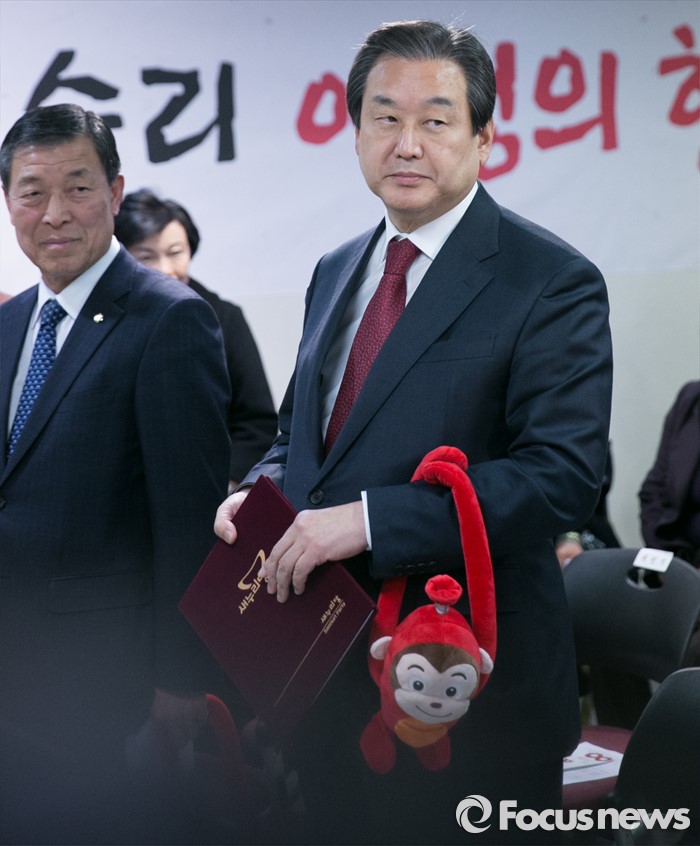 (서울=포커스뉴스) 김무성 새누리당 대표가 11일 오후 서울 여의도 당사에서 열린 2016 중앙여성위원회 신년인사회에 참석해 붉은 원숭이 인형을 팔에 걸고 나서고 있다.