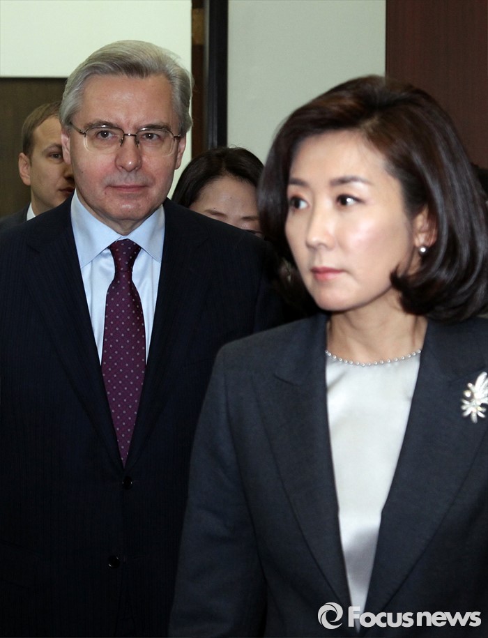(서울=포커스뉴스) 11일 오후 서울 여의도 국회 외교통일위원회에서 열린 북한 핵실험 관련 간담회에 나경원(오른쪽) 위원장과 알렉산드르 안드레예비치 티모닌 주한러시아대사가 참석하고 있다.