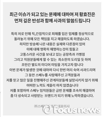 황 대표는 11일 스베누 공식홈페이지에 사과문을 띄우고 “최근 이슈가 되고 있는 문제에 대해 저 황효진은 먼저 깊은 반성과 함께 사과의 말씀을 드린다”고 운을 뗐다.