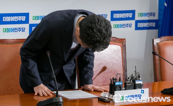 (서울=포커스뉴스) 이목희 더불어민주당 정책위의장이 12일 오전 서울 여의도 국회에서 열린 현안 관련 기자간담회에 앞서 취재진에게 허리 숙여 인사하고 있다.