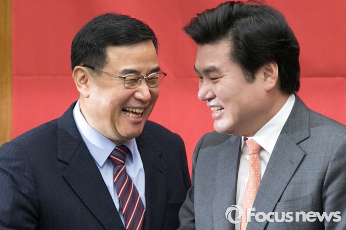 (서울=포커스뉴스) 원유철(오른쪽) 새누리당 원내대표와 김정훈 정책위의장이 12일 오전 서울 여의도 국회에서 열린 원내대책회의에 참석해 인사하고 있다.
