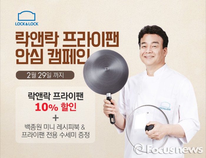 행사 중 락앤락 프라이팬을 구입한 모든 구매 고객에게 프라이팬 전용수세미와 백종원의 집밥 레시피가 담긴 ‘미니 레시피북’을 증정한다.락앤락은 '프라이팬 안심 캠페인'과 프라이팬 프로모션을 오는 2월29일까지 진행한다. <사진제공=락앤락>