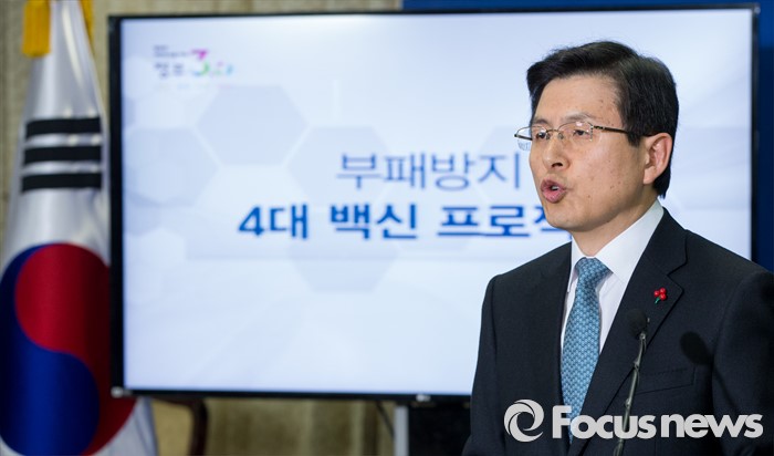 (서울=포커스뉴스) 12일 오전 서울 종로구 정부서울청사에서 황교안 국무총리가 부패방지 4대 백신 프로젝트를 발표하고 있다. 정부는 이날 발표를 통해 실시간 감시, 리스크 관리, 정보상시 공유ㆍ연계, 내부클린시스템의 4대 백신 프로젝트를 2016년 부터 16개 분야, 240조원 운용 규모의 공공시스템에 본격 가동한다고 밝혔다.