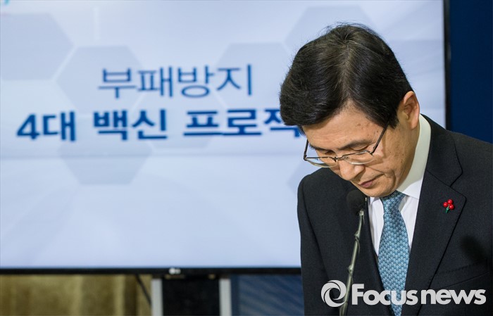 (서울=포커스뉴스) 12일 오전 서울 종로구 정부서울청사에서 황교안 국무총리가 부패방지 4대 백신 프로젝트를 발표 전 인사하고 있다. 정부는 이날 발표를 통해 실시간 감시, 리스크 관리, 정보상시 공유ㆍ연계, 내부클린시스템의 4대 백신 프로젝트를 2016년 부터 16개 분야, 240조원 운용 규모의 공공시스템에 본격 가동한다고 밝혔다.
