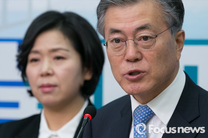 (서울=포커스뉴스) 문재인(오른쪽) 더불어민주당 대표가 12일 오전 서울 여의도 국회 당대표실에서 양향자(왼쪽) 전 삼성전자 상무의 입당 기자회견에 참석해 인사말을 하고 있다. 양 전 상무는 삼성전자 최초의 고졸여성 임원으로 삼성전자 메모리사업부 플래시 개발실 상무를 역임했다.