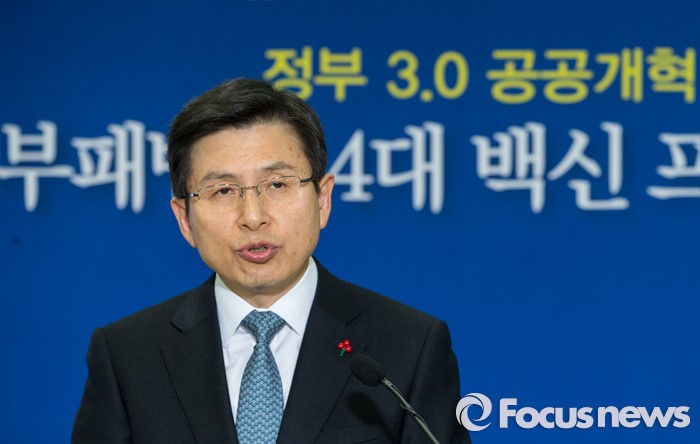 (서울=포커스뉴스) 12일 오전 서울 종로구 정부서울청사에서 황교안 국무총리가 부패방지 4대 백신 프로젝트를 발표하고 있다. 정부는 이날 발표를 통해 실시간 감시, 리스크 관리, 정보상시 공유ㆍ연계, 내부클린시스템의 4대 백신 프로젝트를 2016년 부터 16개 분야, 240조원 운용 규모의 공공시스템에 본격 가동한다고 밝혔다.