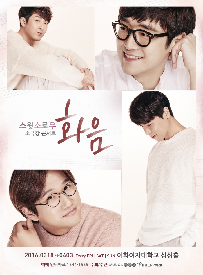 스윗소로우의 ‘화음’은 2014년 7월에 처음 선보인 소극장 공연이다. 감성 가득한 아카펠라부터 팝송 메들리까지 다채로운 선곡은 물론 관객들에게 직접 화음을 가르쳐주는 ‘화성학 강의’ 등 다양한 프로그램으로 재미를 선사해 준다.