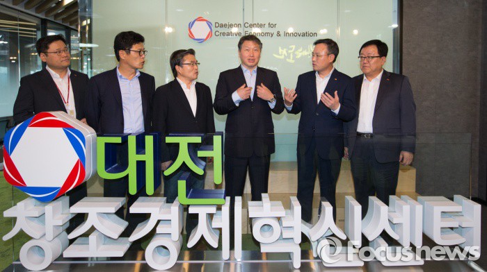 이재호 SK 창조경제혁신사업단 단장(전무)은 “벤처기업이 호소하는 자금과 인력, 기술 부족 문제를 본질적으로 해소할 목적으로 SK그룹의 창조경제 지원조직의 틀과 내용을 모두 업그레이드 했다”면서 “투자금 유치에 따라 부족한 인력을 채용하고 지역 경제가 살아나는 가시적인 성과가 나올 수 있도록 SK가 전력을 다하겠다”고 말했다.(대전=포커스뉴스) 최태원(오른쪽 세번째) SK그룹 회장이 18일 오전 대전시 유성구 대전창조경제혁신센터를 방문해 시설물을 둘러보며 대화를 나누고 있다.2015.08.18 김기태 기자