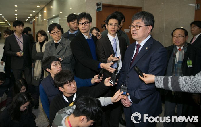 (서울=포커스뉴스) 최원식 더불어민주당 의원이 12일 오전 서울 여의도 국회 정론관에서 탈당 및 국민의당 합류 기자회견을 마친 뒤 취재진 질문에 답하고 있다.