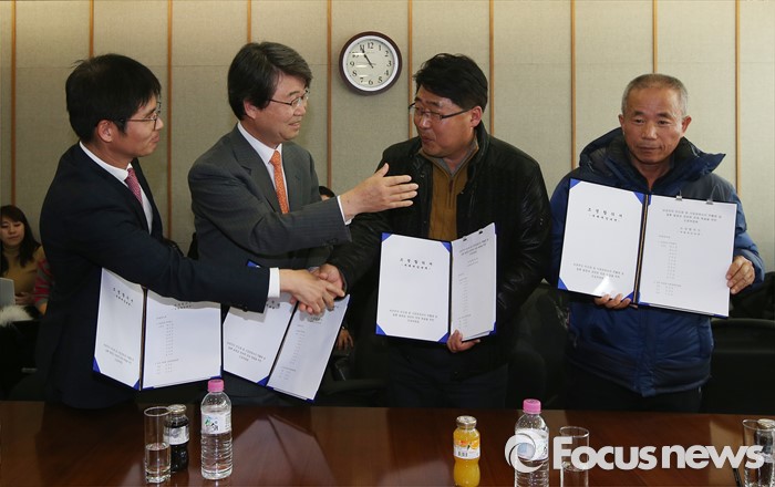 (서울=포커스뉴스) 12일 오전 서울 서대문구 충정로 법무법인 지평 회의실에서 열린 '삼성전자 반도체 등 사업장에서의 백혈병 등 질환 발병과 관련한 문제 해결을 위한 조정위원회'에서 조정 주체 교섭단 대표자들이 최종 합의서에 서명한 뒤 악수를 하고 있다.