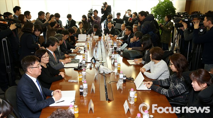 (서울=포커스뉴스) 12일 오전 서울 서대문구 충정로 법무법인 지평 회의실에서 '삼성전자 반도체 등 사업장에서의 백혈병 등 질환 발병과 관련한 문제 해결을 위한 조정위원회'가 열리고 있다.