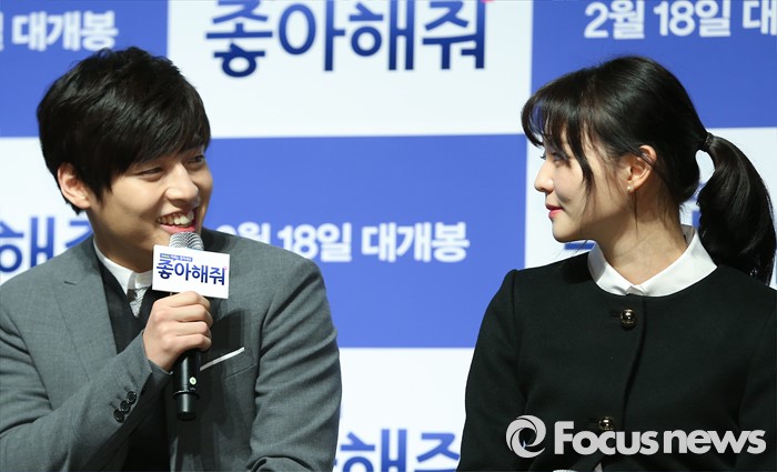 (서울=포커스뉴스) 12일 오전 서울 강남구 압구정 CGV에서 열린 영화 '좋아해줘' 제작보고회에 참석한 배우 강하늘(왼쪽)이 취재진의 질문에 답하고 있다. 왼쪽부터 배우 강하늘, 이솜.
