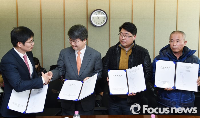 (서울=포커스뉴스) 12일 오전 서울 서대문구 충정로 법무법인 지평 회의실에서 열린 '삼성전자 반도체 등 사업장에서의 백혈병 등 질환 발병과 관련한 문제 해결을 위한 조정위원회'에서 조정 주체 교섭단 대표자들이 최종 합의서에 서명한 뒤 악수를 하고 있다.